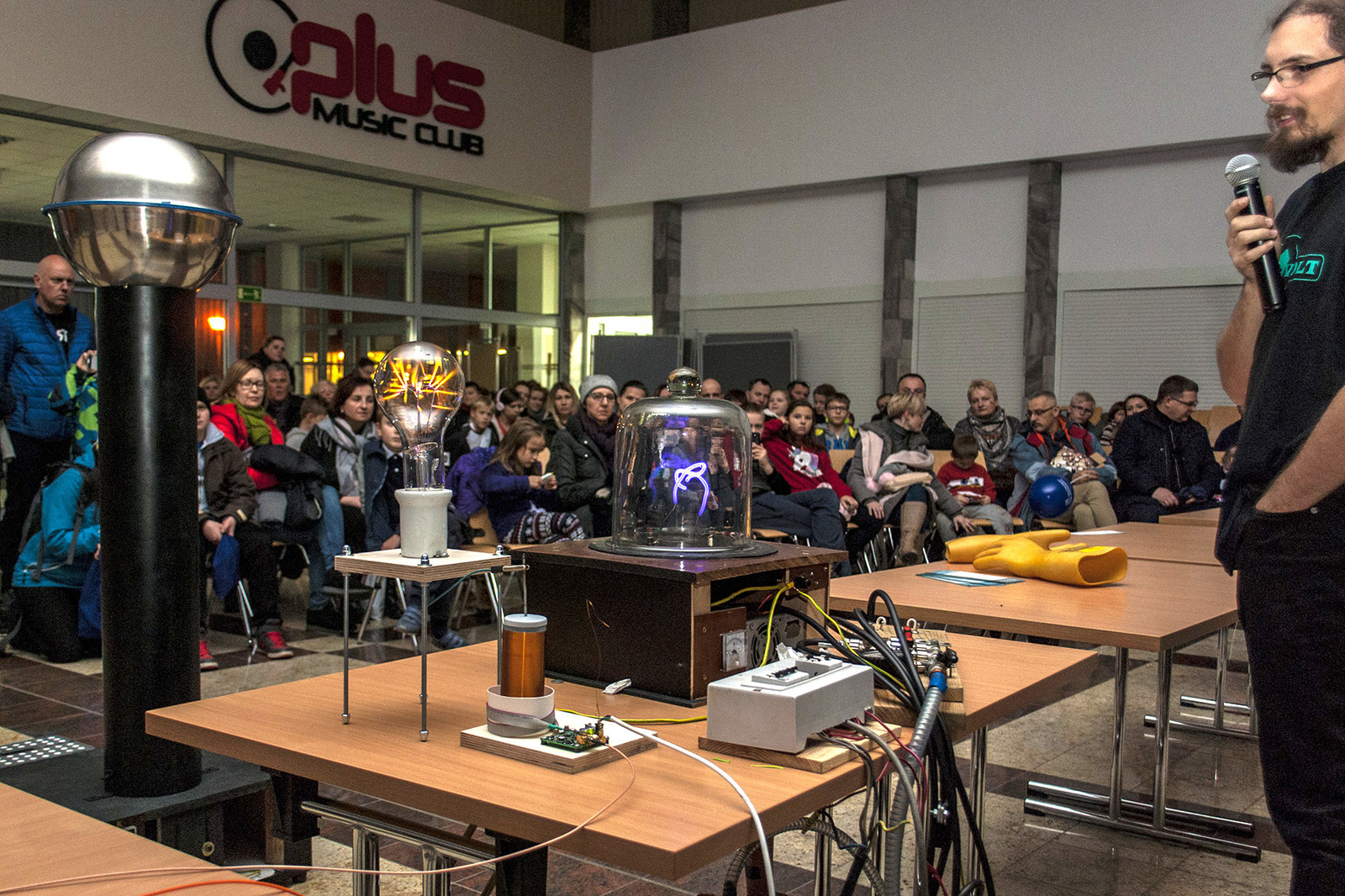 Popularną atrakcją Nocnych Spotkań z Nauką był także „teatr wysokich napięć”, wydarzenie zorganizowane przez firmę Polimedia, partnera Dni Otwartych Politechniki Rzeszowskiej, która współpracuje z uczelnią w ramach Politechniki Dziecięcej. Firma Polimedia przygotowała m.in. spektakl z wykorzystaniem jednych z największych w swoich klasach transformatorów Tesli. Współorganizatorem wydarzenia było Studenckie Koło Naukowe Elektryków „MegaVolt”. Zaprezentowane zostały urządzenia wykonane przez członków koła – generator Van der Graafa, lampowa cewka tesli (VTTC) oraz zademonstrowano wyładowania pod obniżonym ciśnieniem. Wszystkie zawiłości obserwowanych zjawisk i urządzeń wyjaśniał opiekun koła – mgr inż. Sebastian Hajder.